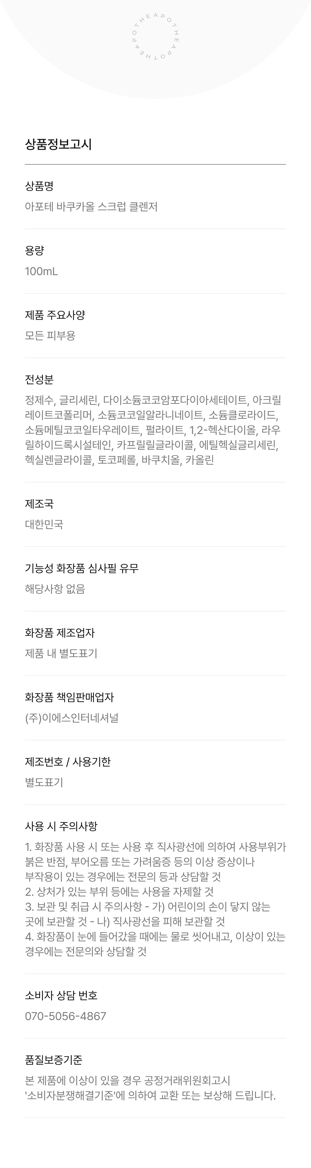 정제수, 글리세린, 다이소듐코코암포다이아세테이트, 아크릴레이트코폴리머, 소듐코코일알라니네이트, 소듐클로라이드, 소듐메틸코코일타우레이트, 펄라이트, 1,2-헥산다이올, 라우릴하이드록시설테인, 카프릴릴글라이콜, 에틸헥실글리세린, 헥실렌글라이콜, 토코페롤, 바쿠치올, 카올린